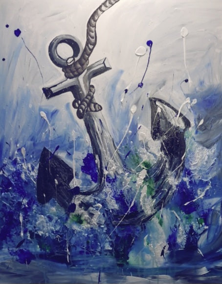 Anchor in the Storm captures the raw tension between chaos and stability. A solitary anchor, rendered in bold strokes of black and gray, stands firm amid a swirl of crashing blues and turbulent splashes. The expressive brushwork and dynamic composition evoke the feeling of being submerged in uncertainty, yet grounded by resilience. This painting speaks to the human need for something steady—something that holds us fast when the world around us is in motion!!!