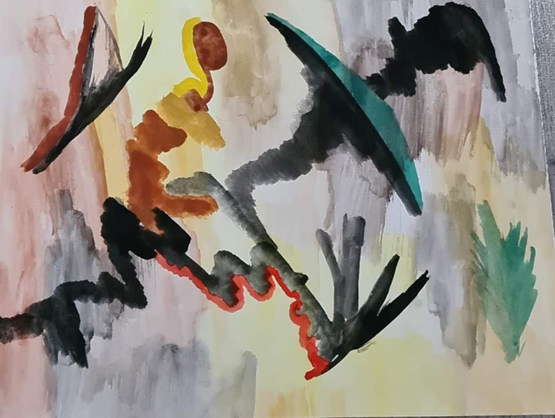 A visceral dance of color and form, Collision of Echoes explores the tension between chaos and clarity. Jagged black lines slice through muted washes, while earthy tones and organic shapes hint at a fragmented figure—perhaps human, perhaps memory. The interplay of red, green, and yellow evokes emotion without resolution, inviting the viewer to interpret their own story within the abstract. This piece is both confrontation and reflection—a visual echo of inner landscapes.