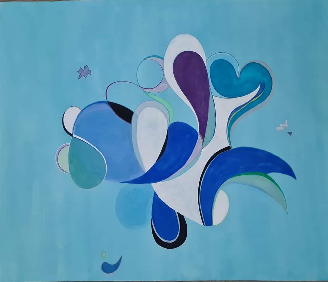 Driftforms is a celebration of motion and harmony, where curved shapes and layered hues swirl across a tranquil blue field. Shades of purple, green, and white intertwine like petals caught in a breeze, while zigzags and loops add playful punctuation to the composition. The painting evokes a sense of gentle rhythm—fluid, dreamlike, and alive. It invites the viewer to wander through its forms, discovering new relationships between color and shape with each glance.