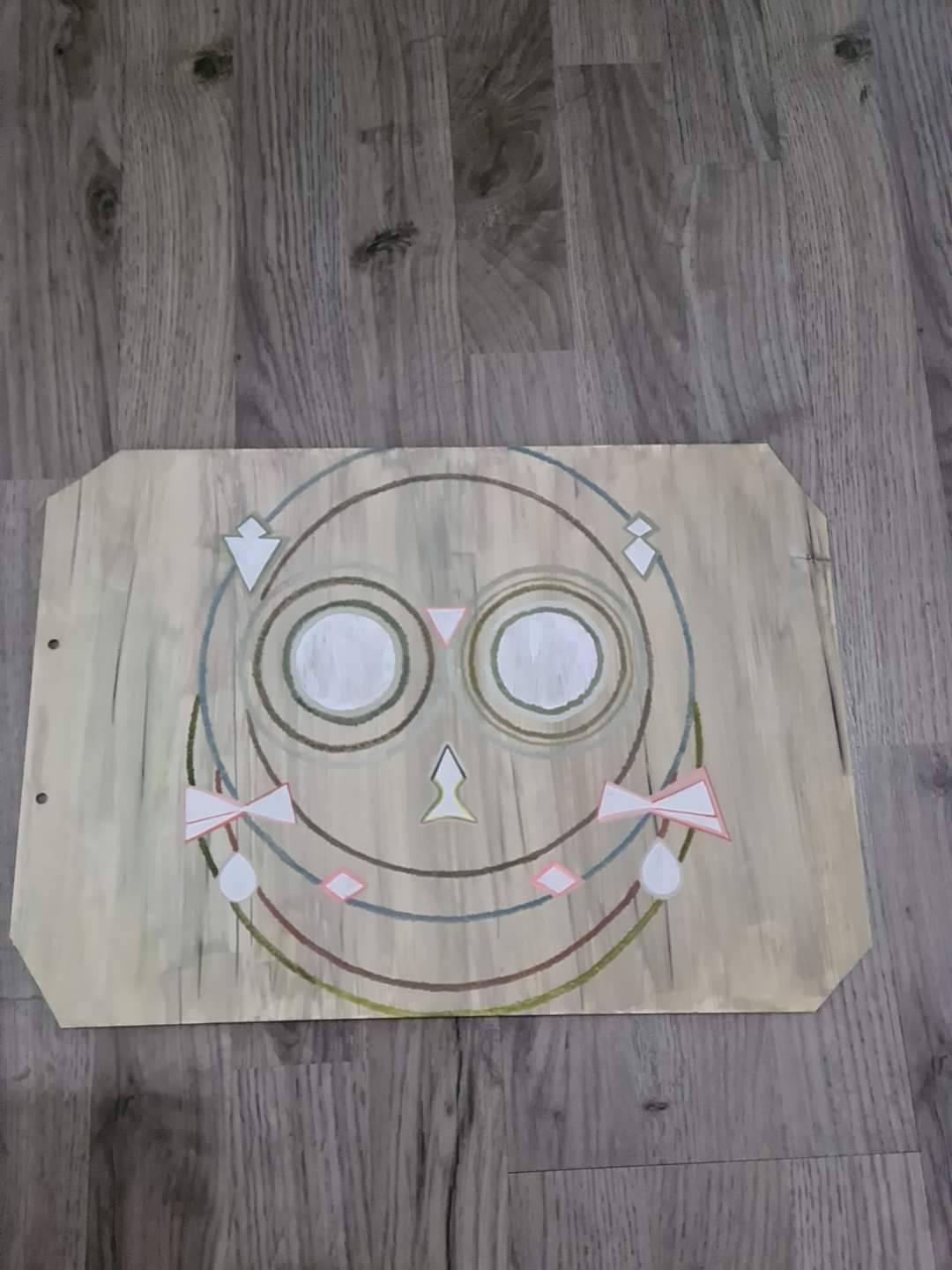 Guardian is a powerful fusion of tribal symbolism and modern abstraction. Painted on wood with geometric precision, this symmetrical design evokes the presence of a stylized mask—an ancient sentinel watching over unseen realms. The bold eyes, central triangle, and rhythmic arrangement of diamonds and curves suggest both mystery and protection. Hues of white, pink, and yellow pop against the natural grain, creating a vibrant contrast that feels both grounded and transcendent. With its raw edges and mounting holes, this piece is ready to bring depth and character to any space—ideal for collectors drawn to cultural motifs and contemporary craft.