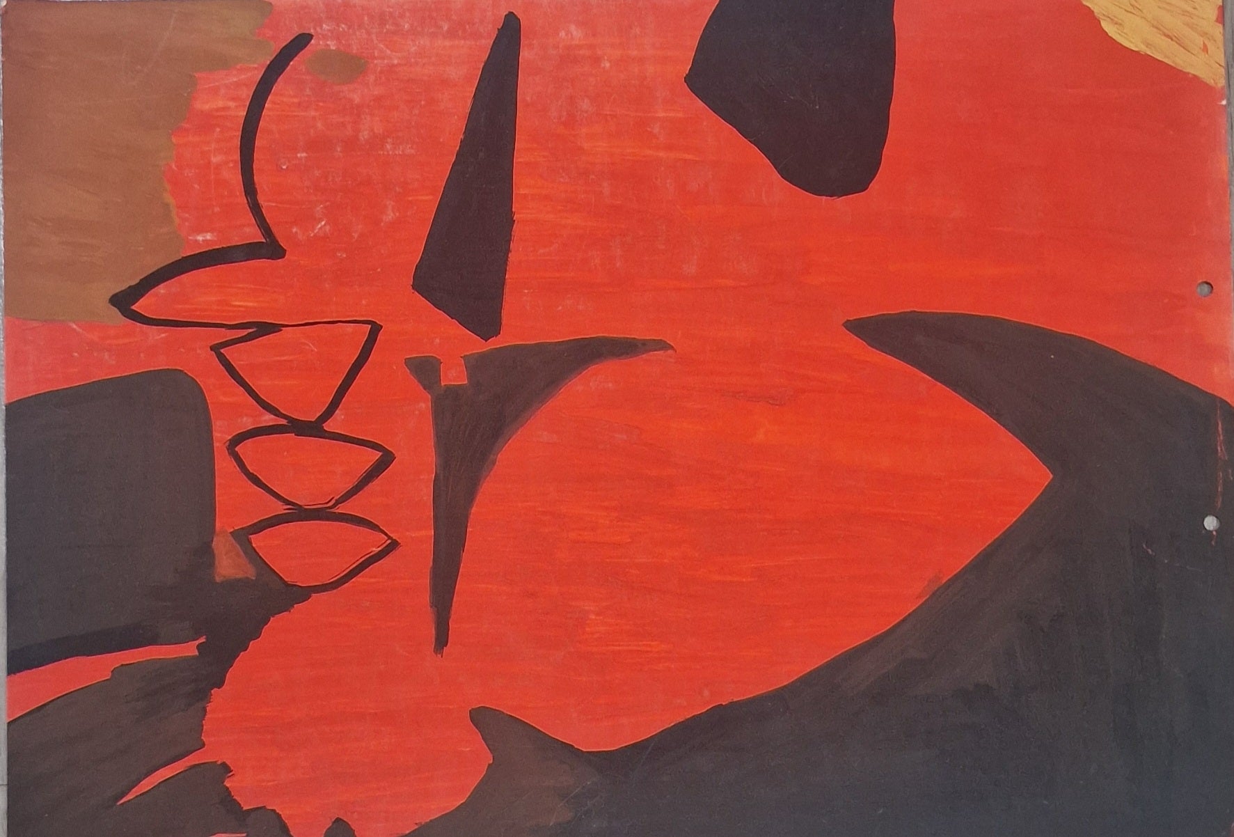 Ritual in Red is a powerful abstract piece that commands attention with its deep crimson backdrop and layered black and brown forms. Three stacked triangular outlines on the left suggest shields, arrowheads, or ancient symbols, while sweeping brushstrokes and textured overlays create a sense of motion and depth. A burst of orange and yellow in the top corner adds contrast and energy, like fire breaking through shadow. This artwork speaks to themes of strength, heritage, and transformation—perfect for collectors drawn to bold expression and cultural resonance.